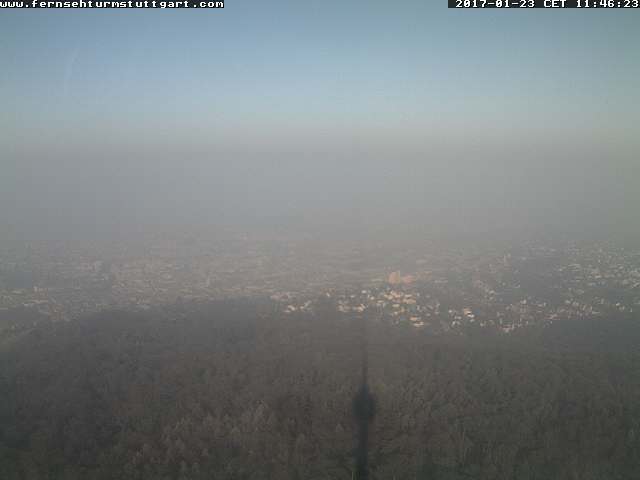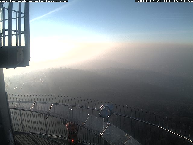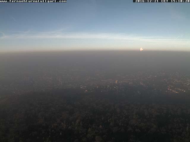 Diese 3 Bilder stammen von den Webcams auf dem Stuttgarter Fernsehturm (externer Link zu www.fernsehturm-stuttgart.de) während einer starken Inversionswetterlage am 21.12.2016 um etwa 15:00h. Die Kameras sind nach Süden (Degerloch), auf das Zentrum und den Osten von Stuttgart (Frauenkopf-Funkturm) gerichtet. Der Fernsehturm selbst steht im Südosten von Stuttgart. Es herrschte an diesem Tag eine windstille Hochdruckwetterlage, in Degerloch unterhalb des Fernsehturms betrug die Temperatur etwas unter Null Grad Celsius, die relative Luftfeuchte lag bei etwas über 70%. Die etwas kältere und schwerere Luft war über Nacht in den Talkessel, in dem die City von Stuttgart liegt, abgesunken. In vertikaler Richtung fand so gut wie kein Luftaustausch mehr statt, so dass sich die Luftschadstoffe des Verkehrs und der Heizungen am Vormittag massiv aufkonzentrierten. Gegen 15:00h hatte sich die Dunstglocke so weit aufgeheizt, dass sich die deutlich erkennbare Luftmassengrenze auf um die 500m Höhe anhob, und knapp unter dem Aussichtskorb des Fernsehturms zu liegen kam (auf etwas mehr als 650m über Meeresspiegel). Der leicht bewegliche Feinstaub erreichte um diese Zeit schließlich auch die Höhen von Degerloch.