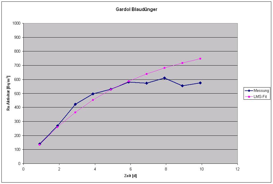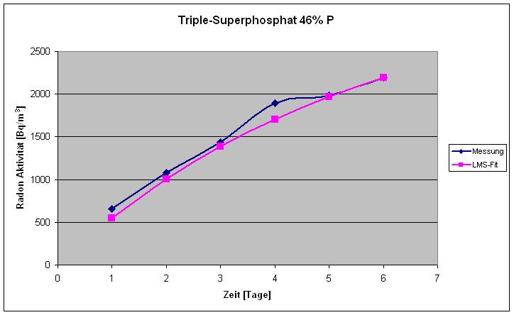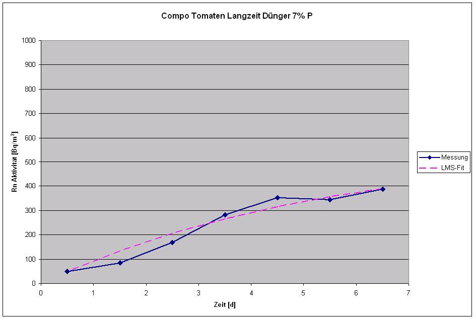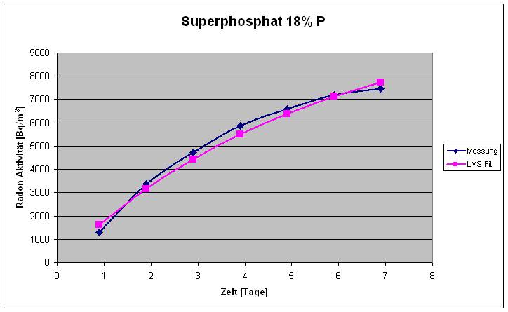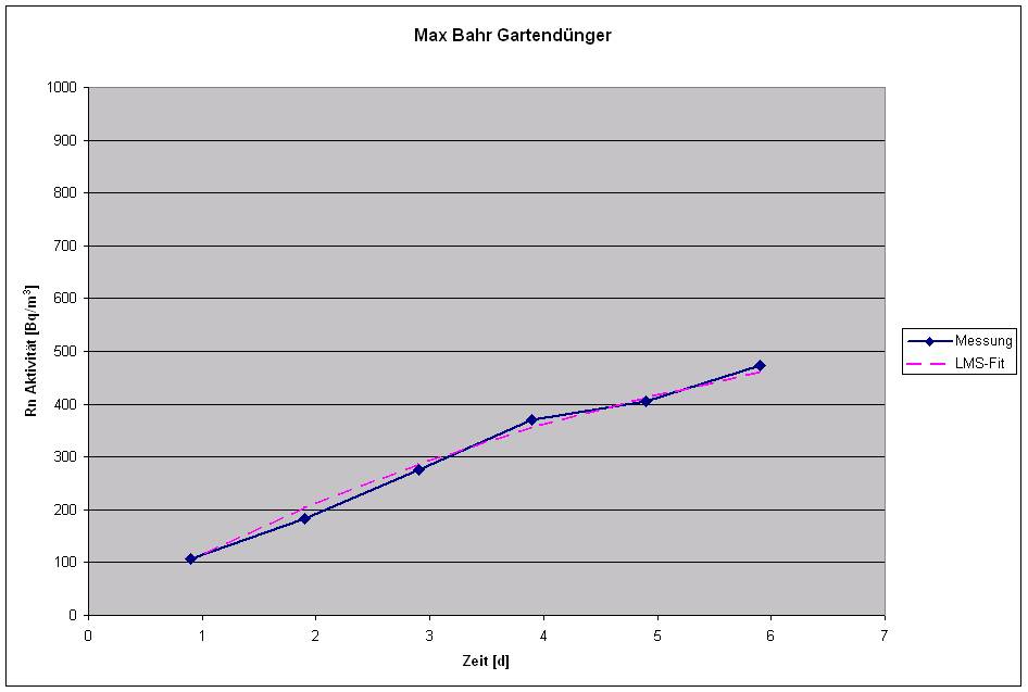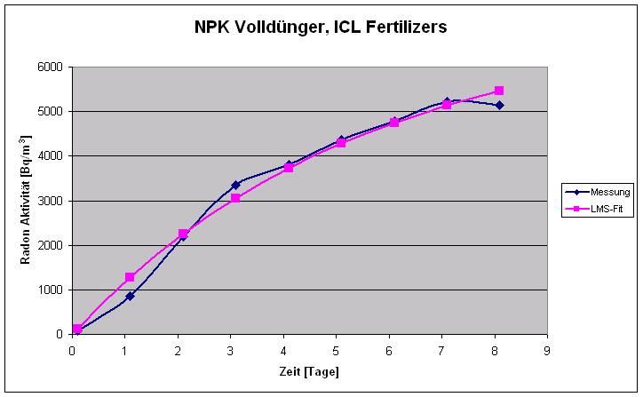Dem Messkonzept liegt die Erkenntnis zu Grunde, dass der Detektor nicht nennenswert durch direkte Strahlung des Düngemittels beeinflusst wird. Ferner reicht es um eine grobe quantitative Vorstellung zu bekommen, nur den Aktivitätsanstieg, des Radon, welcher sich ebenfalls mit der Zerfallskonstante aufbaut, zu vermessen. Durch einen Least-Mean-Sqare Fit einer e-Funktion mit der Zerfallskonstante des Radon, kann auf den Aktivitätsendwert extrapoliert werden.