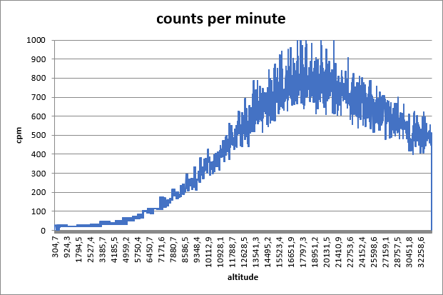 Heutzutage kann man diese damals doch sehr aufwändige Erkenntnis auch ganz einfach mit einem kleinen-Mikrocontroller und einem Selbstbau-Geigerzähler im Rahmen einer GFS (Gleichwertige Feststellung einer Schülerleistung, oder umgangssprachlich "die Ganze Familie Schafft") auch im Familienkreis machen. Man packt einfach beides in eine kleine Box und bindet sie an einen Wetterballon, den man in entsprechenden Shops im Internet samt Gasfüllung kaufen kann. Für die Schüler ist das ein total aufregendes und völlig cooles Erlebnis und die physikalischen Zusammenhänge lassen sich so gleich viel leichter lernen, jedenfalls wenn am Ende alles geklappt hat. Die Kurve die ein SBM-20 Zählrohr liefert und die ein Raspi auf den USB-Stick speichert, sieht ganz eindrucksvoll und überzeugend aus und belegt, dass sich die Forscher am Anfang des 20. Jahrhunderts nicht getäuscht haben. Der Umrechnungsfaktor für das SBM-20 Zählrohr in der folgenden Grafik beträgt etwa 175cpm/(uSv/h). Man kommt also in unseren Breitengraden zu einem Maximum von etwa 4.3uSv/h in 18km Höhe. Diese Intensität der Strahlung wird allerdings mit der Sonnenfleckentätigkeit und der Nähe zu den magnetischen Polen, welche die geladenen Teilchen von der Sonne anziehen, variieren.