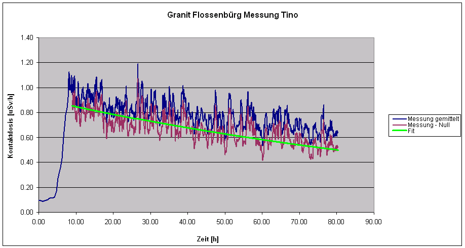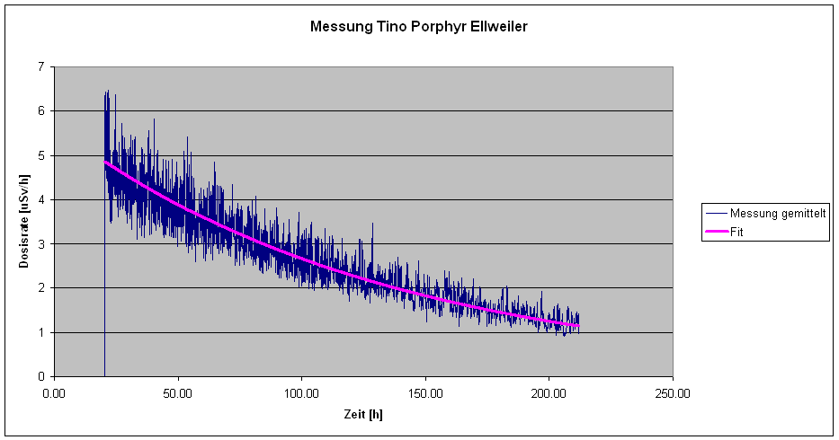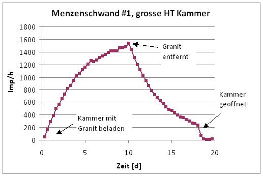 Diese Grafik zeigt eine Messung der Radon-Exhalation in einer Kammer, die zunächst (Zeitpunkt 0) mit einem Granitstein aus Menzenschwand beladen wurde. Nach 10 Tagen wurde der Stein wieder entfernt, die Kammer gleich wieder verschlossen und die Messung lief weiter. Nach 18 Tagen wurde die Kammer bei laufendem Detektor schließlich ganz geöffnet. Man sieht deutlich den Aufbau der Radon-Aktivität mit der Halbwertszeit von 3.8 Tagen und danach den Zerfall. Zugegeben, es war kein normaler Geigerzähler, der hier Verwendung fand, es war das "Radon-Geigerle", ein auf Alpha-Strahlung empfindlich gemachtes "Stuttgarter Geigerle". Aber der Aufwand und die Kosten dafür sind überraschend gering, man muss dazu nur die Photodioden auswechseln. Bei weiteren Untersuchungen zeigte sich dann auch, dass ganz normales Granit-Baumaterial je nach Herkunft bzw. Urangehalt ganz schön Radon ausgasen kann. Mehr dazu in den folgenden Dokumenten.