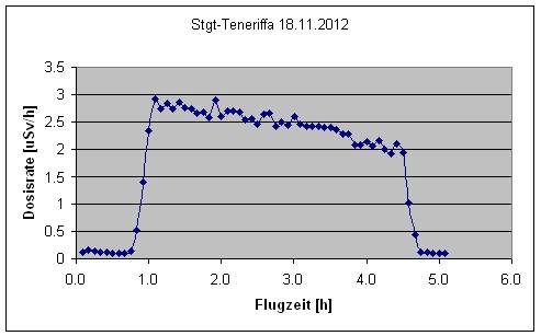 Diese Antwort wird in vielen Fällen benutzt um Menschen, die nach einer Dosis fragen zu beruhigen. Ich wollte es nun aber einmal sicher wissen, wieviel das ist und habe auf einer Kurzurlaubsreise einen Geigerzähler (Gammascout) mitlaufen lassen. Das Ergebnis war, die 4 1/2 stündige Flugreise von Stuttgart nach Teneriffa auf 10900m Höhe erzeugt eine Dosis von etwa 13uSv, wobei die Dosisrate nach dem Start mit fast 3uSv/h am höchsten war. Der Schnitt lag etwa bei 2.5uSv/h. Das passt zu den Werten aus der Literatur und dem Internet. Auf dem Hinflug nahm die Dosisrate Richtung Süden kontinuierlich ab (auf dem Rückflug war es umgekehrt). Das liegt offenbar am magnetischen Feld der Erde, welches um so höher ist, je näher der Ort an einem magnetischen Pol liegt. Deswegen erzeugen die Polrouten (USA, Japan) höhere Strahlenexpositionen.