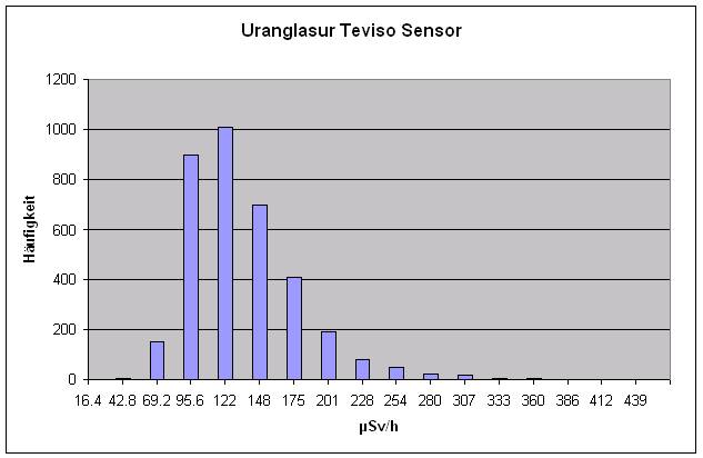 Grafik einer gemessenen Poisson-Verteilung der Zählrate eines Teviso RD2007 Sensormoduls berechnet aus 10 Pulsen, der gemessenen Zeit und Umrechnung in µSv/h. Gemessen wurde direkt auf der Oberfläche einer Keramikschale mit Uranglasur. Der Umrechnungsfaktor beträgt laut Hersteller 3.4cpm pro µSv/h. MS Excel-Daten siehe Downloadbereich.